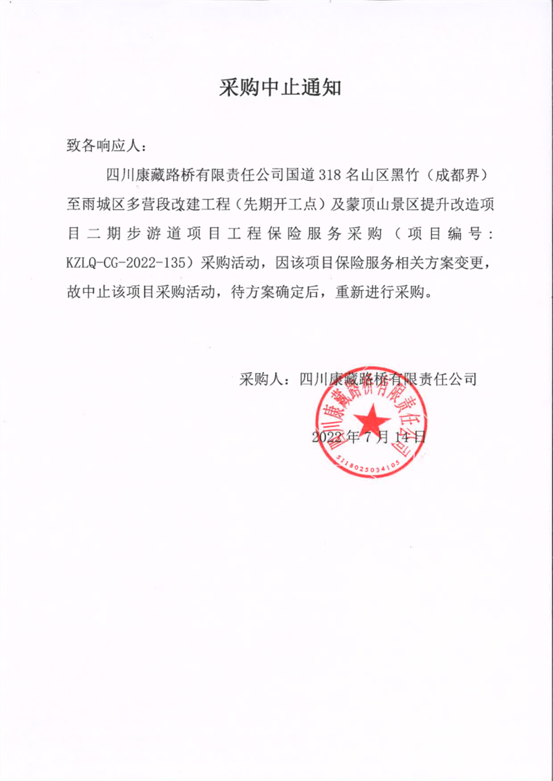 四川康藏路橋有限責(zé)任公司國道318名山區(qū)黑竹(成都界)至雨城區(qū)多營段改建工程(先期開工點(diǎn))及蒙頂山景區(qū)提升改造項(xiàng)目二期步游道項(xiàng)目工程保險服務(wù)采購中止通知