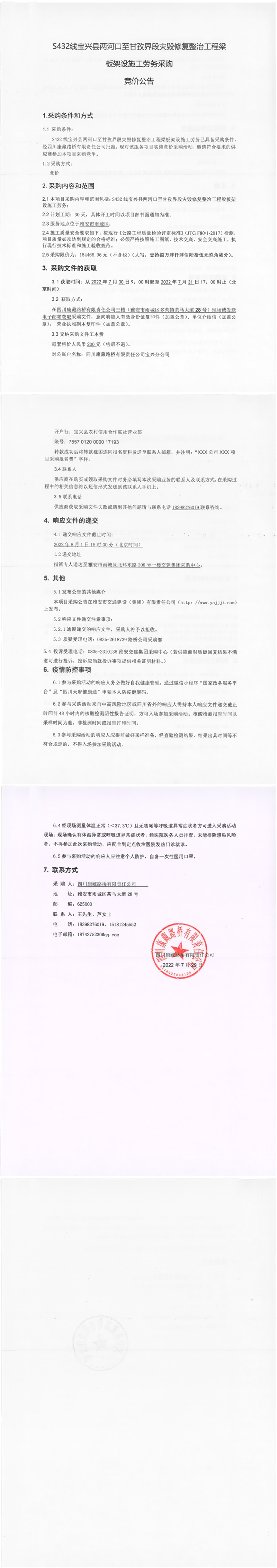 四川康藏路橋有限責(zé)任公司S432線寶興縣兩河口至甘孜界段災(zāi)毀修復(fù)整治工程梁板架設(shè)施工勞務(wù)采購競價(jià)公告