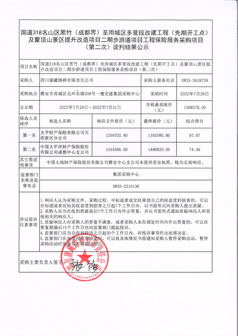 四川康藏路橋有限責(zé)任公司國(guó)道318名山區(qū)黑竹(成都界)至雨城區(qū)多營(yíng)段改建工程(先期開(kāi)工點(diǎn))及蒙頂山景區(qū)提升改造項(xiàng)目二期步游道項(xiàng)目工程保險(xiǎn)服務(wù)采購(gòu)項(xiàng)目(第二次)談判結(jié)果公示
