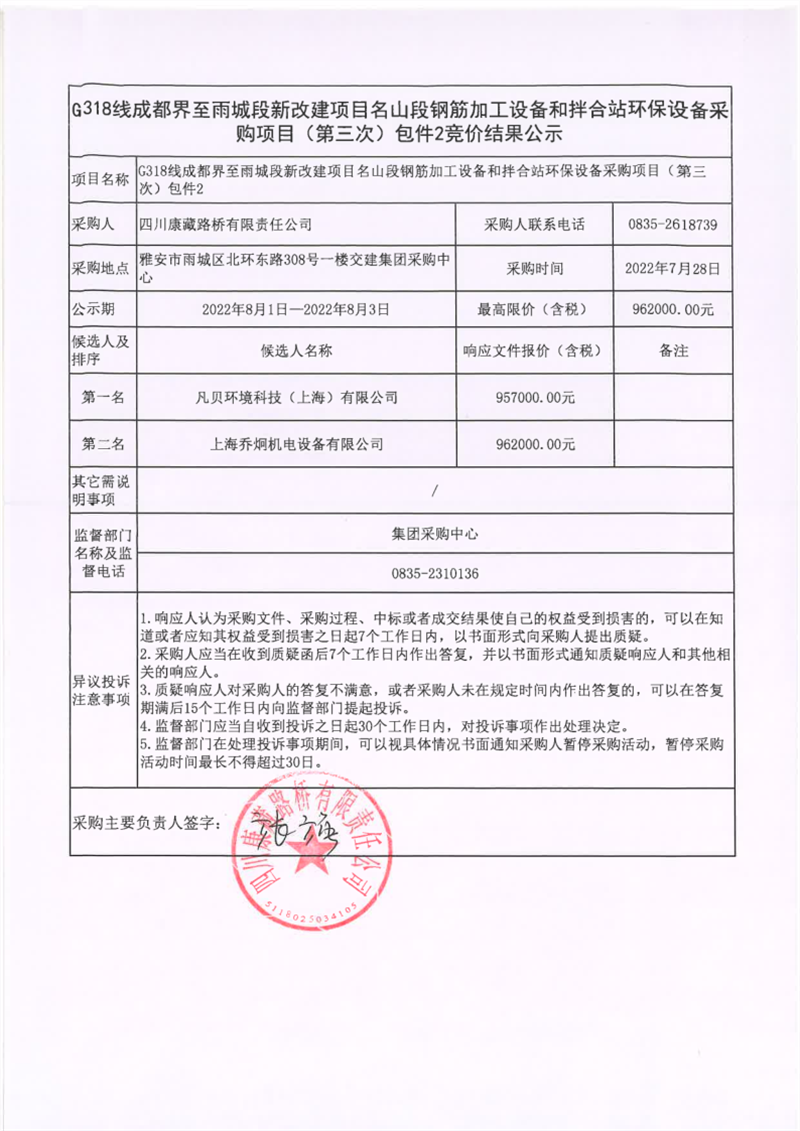 四川康藏路橋有限責(zé)任公司G318線成都界至雨城段新改建項(xiàng)目名山段鋼筋加工設(shè)備和拌合站環(huán)保設(shè)備采購項(xiàng)目(第三次)包件2競價(jià)結(jié)果公示