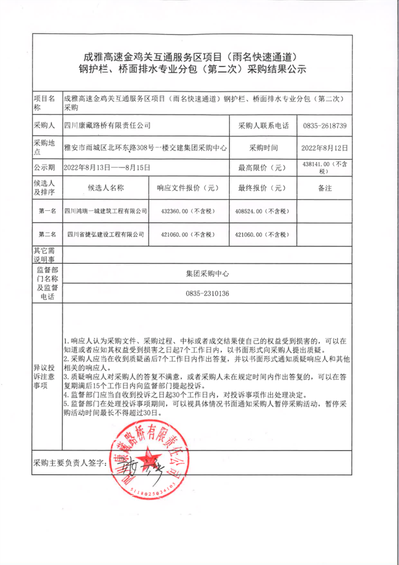 四川康藏路橋有限責(zé)任公司成雅高速金雞關(guān)互通服務(wù)區(qū)項目(雨名快速通道)鋼護(hù)欄、橋面排水專業(yè)分包(第二次)采購結(jié)果公示