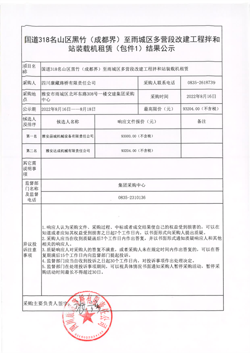 四川康藏路橋有限責(zé)任公司國(guó)道318名山區(qū)黑竹(成都界)至雨城區(qū)多營(yíng)段改建工程拌和站裝載機(jī)租賃(包件1)結(jié)果公示