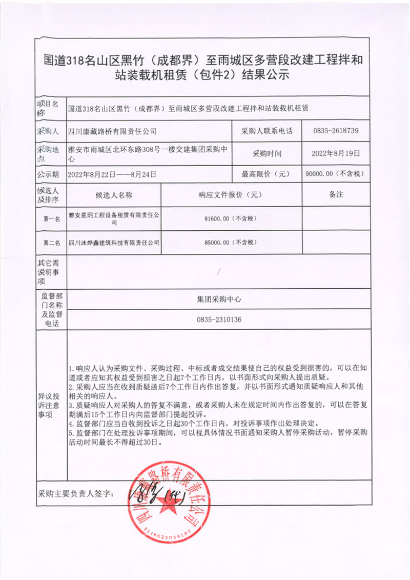 四川康藏路橋有限責任公司國道318名山區(qū)黑竹(成都界)至雨城區(qū)多營段改建工程拌和站裝載機租賃(包件2)結(jié)果公示