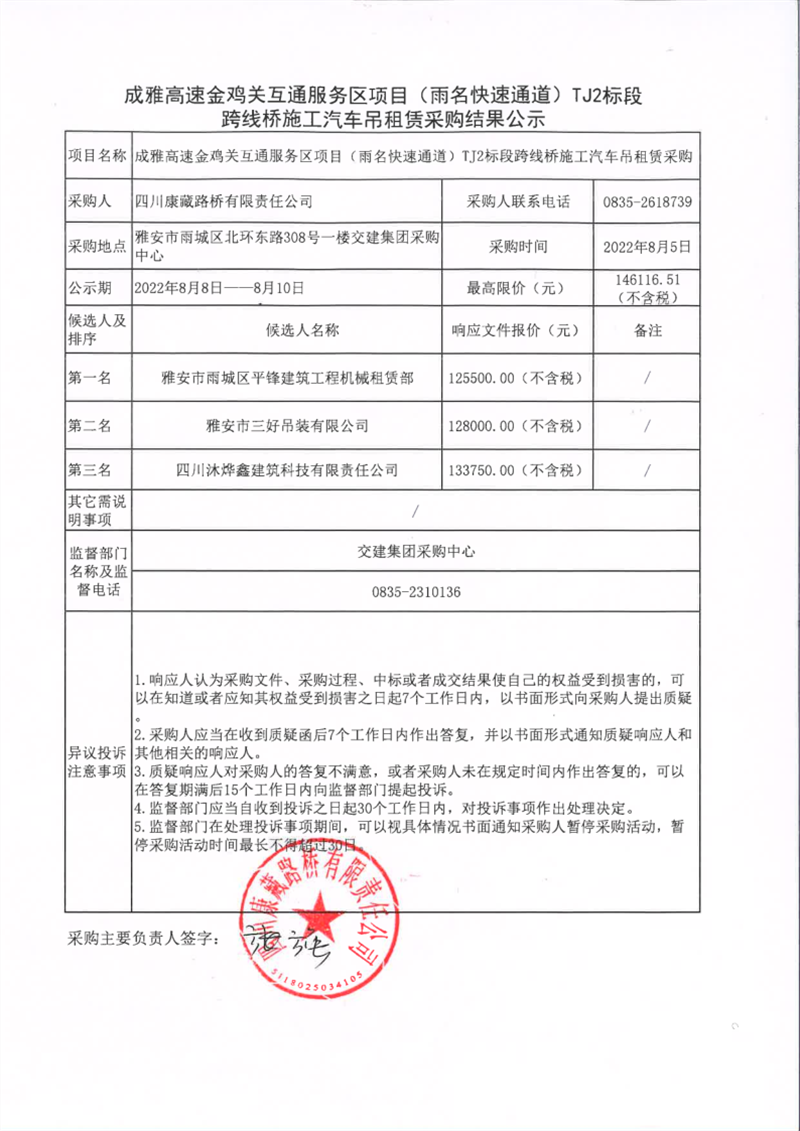 四川康藏路橋有限責(zé)任公司成雅高速金雞關(guān)互通服務(wù)區(qū)項目(雨名快速通道)TJ2標(biāo)段跨線橋施工汽車吊租賃采購結(jié)果公示