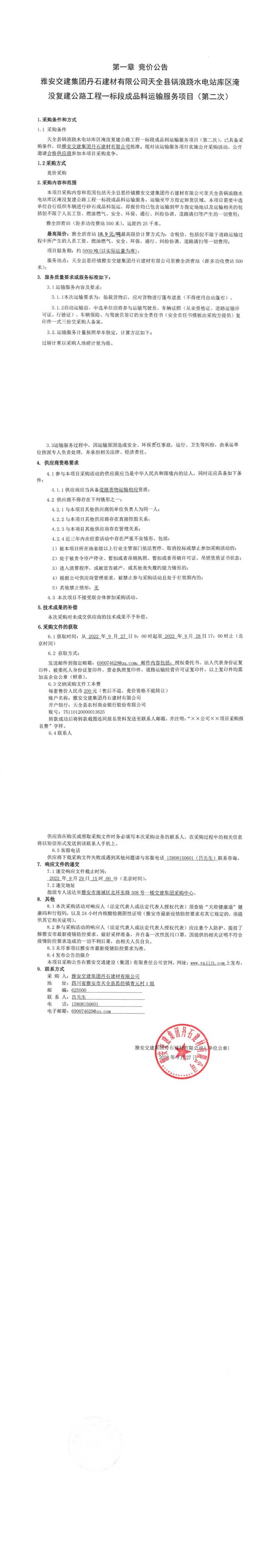 雅安交建集團(tuán)丹石建材有限公司天全縣鍋浪蹺水電站庫(kù)區(qū)淹沒(méi)復(fù)建公路工程一標(biāo)段成品料運(yùn)輸服務(wù)項(xiàng)目(第二次)競(jìng)價(jià)公告