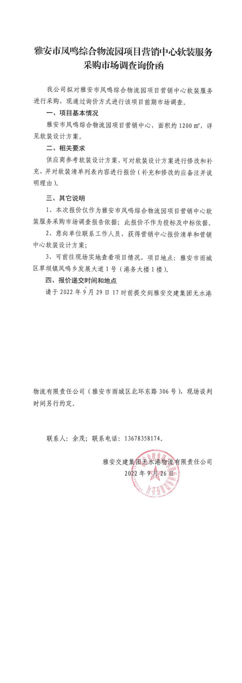雅安交建集團(tuán)無水港物流有限責(zé)任公司雅安市鳳鳴綜合物流園項(xiàng)目營(yíng)銷中心軟裝服務(wù)采購(gòu)市場(chǎng)調(diào)查詢價(jià)函