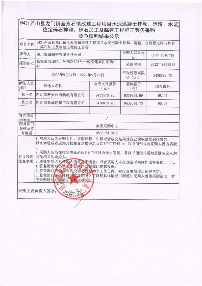 四川康藏路橋有限責(zé)任公司S431蘆山縣龍門(mén)鎮(zhèn)至雙石鎮(zhèn)改建工程項(xiàng)目水泥混凝土拌和、運(yùn)輸、水泥穩(wěn)定碎石拌和、碎石加工及臨建工程施工勞務(wù)采購(gòu)競(jìng)爭(zhēng)談判結(jié)果公示