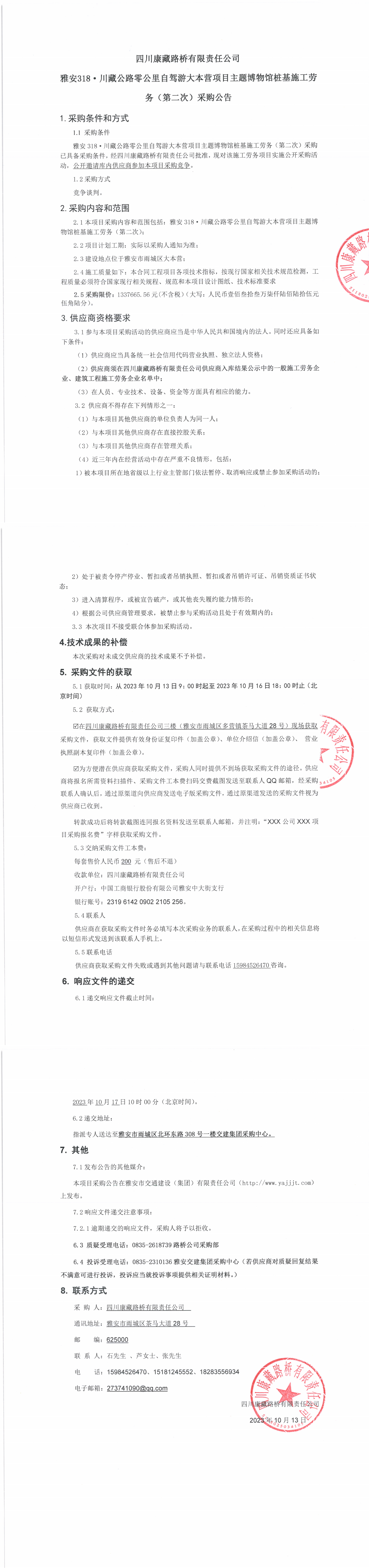 四川康藏路橋有限責任公司雅安318·川藏公路零公里自駕游大本營項目主題博物館樁基施工勞務(wù)(第二次)采購公告