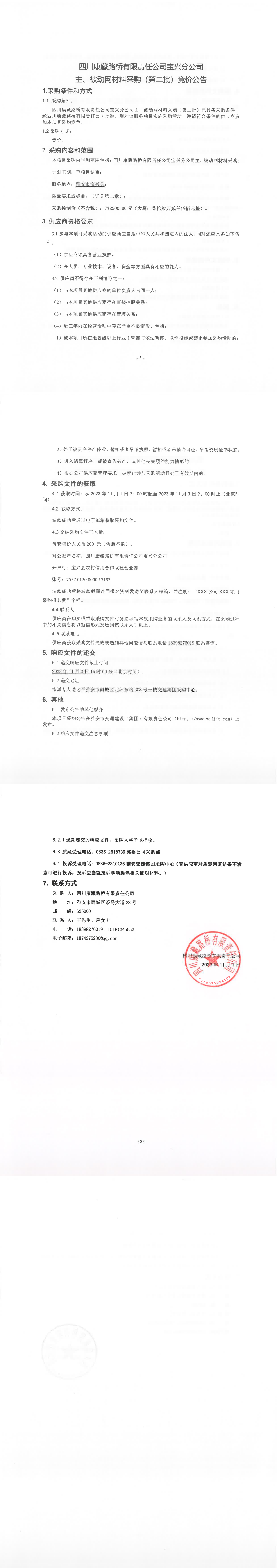 四川康藏路橋有限責(zé)任公司寶興分公司主、被動網(wǎng)材料采購(第二批)競價公告