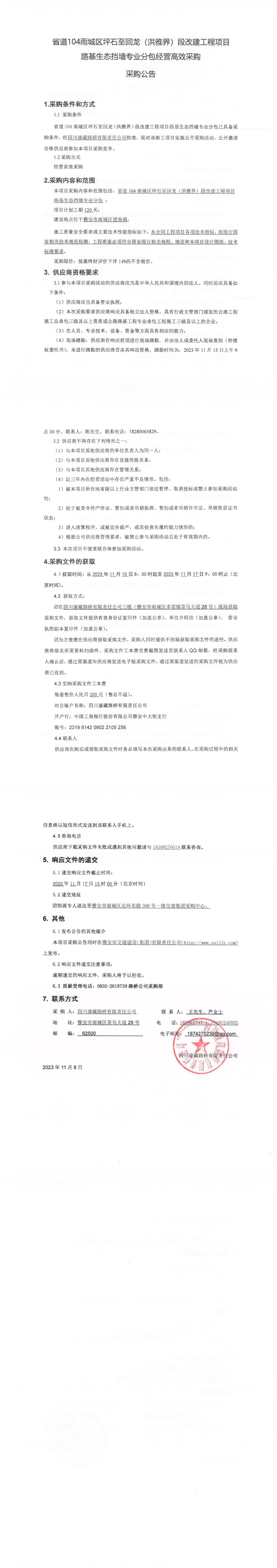 四川康藏路橋有限責(zé)任公司省道104雨城區(qū)坪石至回龍(洪雅界)段改建工程項(xiàng)目路基生態(tài)擋墻專業(yè)分包經(jīng)營高效采購公告