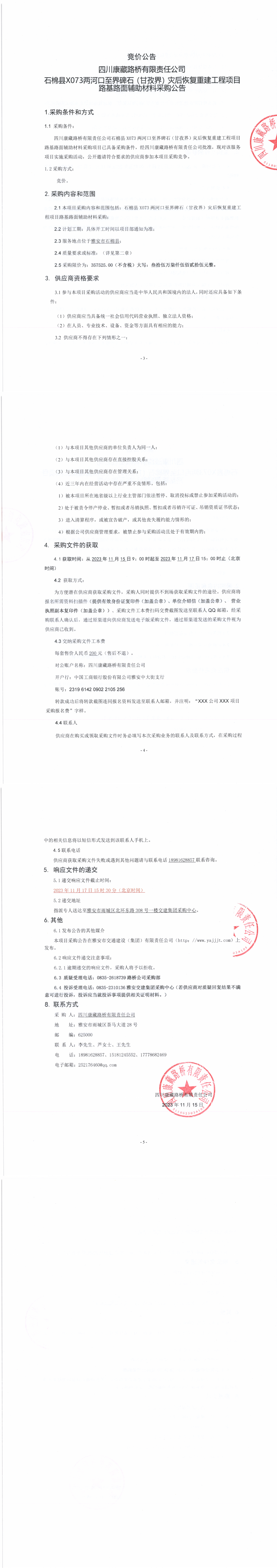 四川康藏路橋有限責(zé)任公司石棉縣X073兩河口至界碑石(甘孜界)災(zāi)后恢復(fù)重建工程項目路基路面輔助材料采購公告