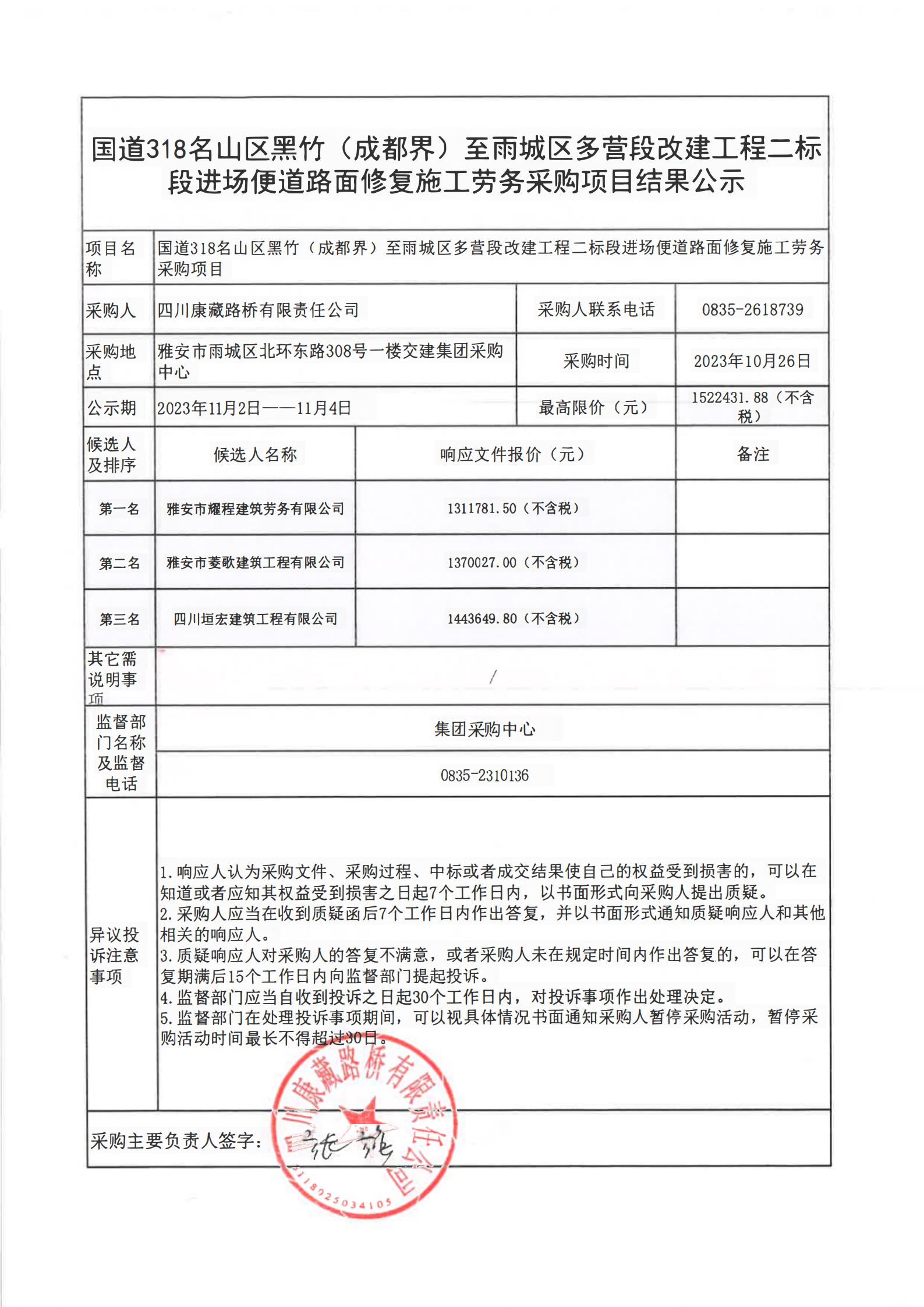 四川康藏路橋有限責(zé)任公司國(guó)道318名山區(qū)黑竹(成都界)至雨城區(qū)多營(yíng)段改建工程二標(biāo)段進(jìn)場(chǎng)便道路面修復(fù)施工勞務(wù)采購項(xiàng)目結(jié)果公示