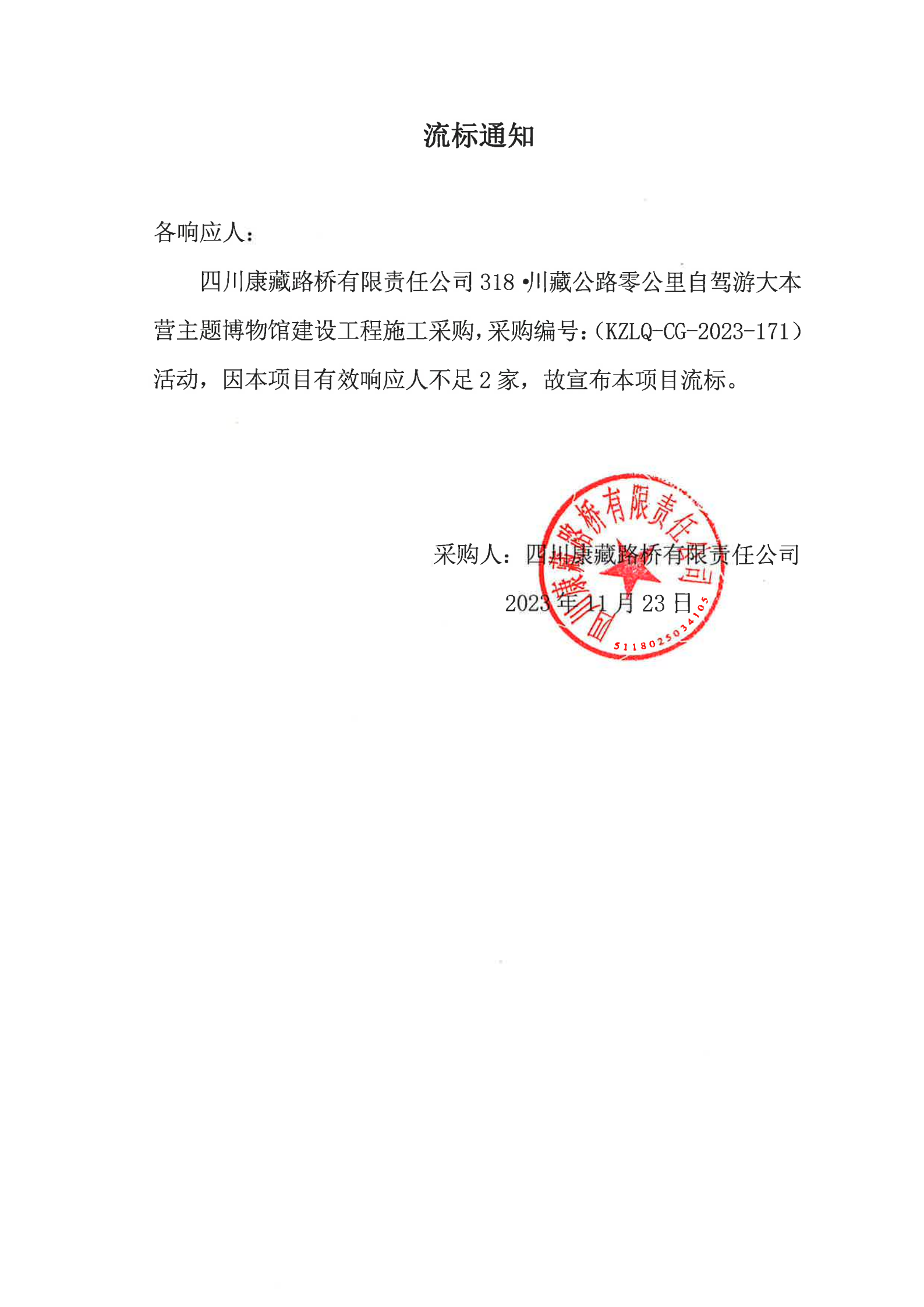 四川康藏路橋有限責任公司318·川藏公路零公里自駕游大本營主題博物館建設工程施工采購流標通知