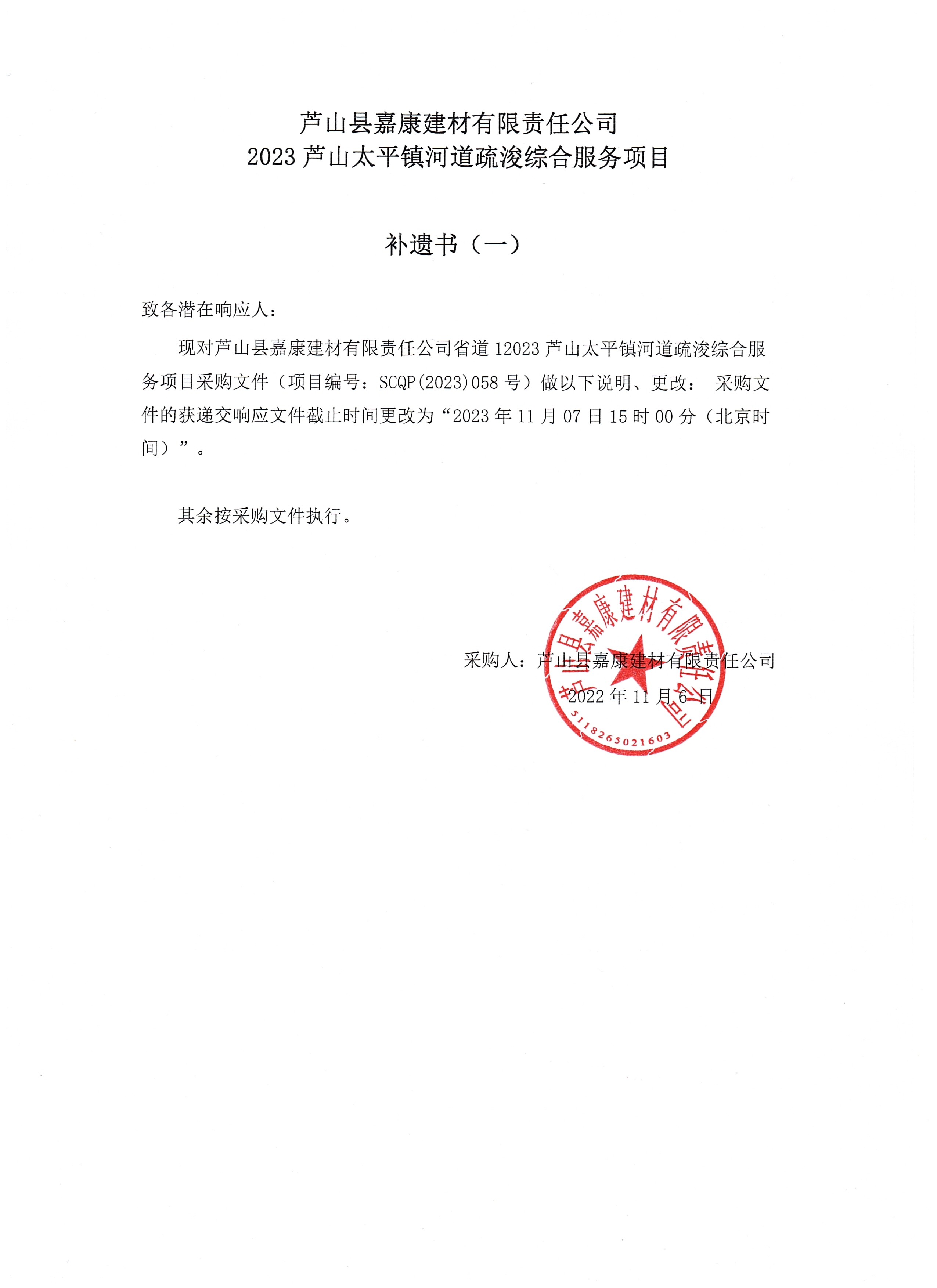 蘆山縣嘉康嘉康建材有限責(zé)任公司2023蘆山太平鎮(zhèn)河道疏浚綜合服務(wù)項目補(bǔ)遺書(一)