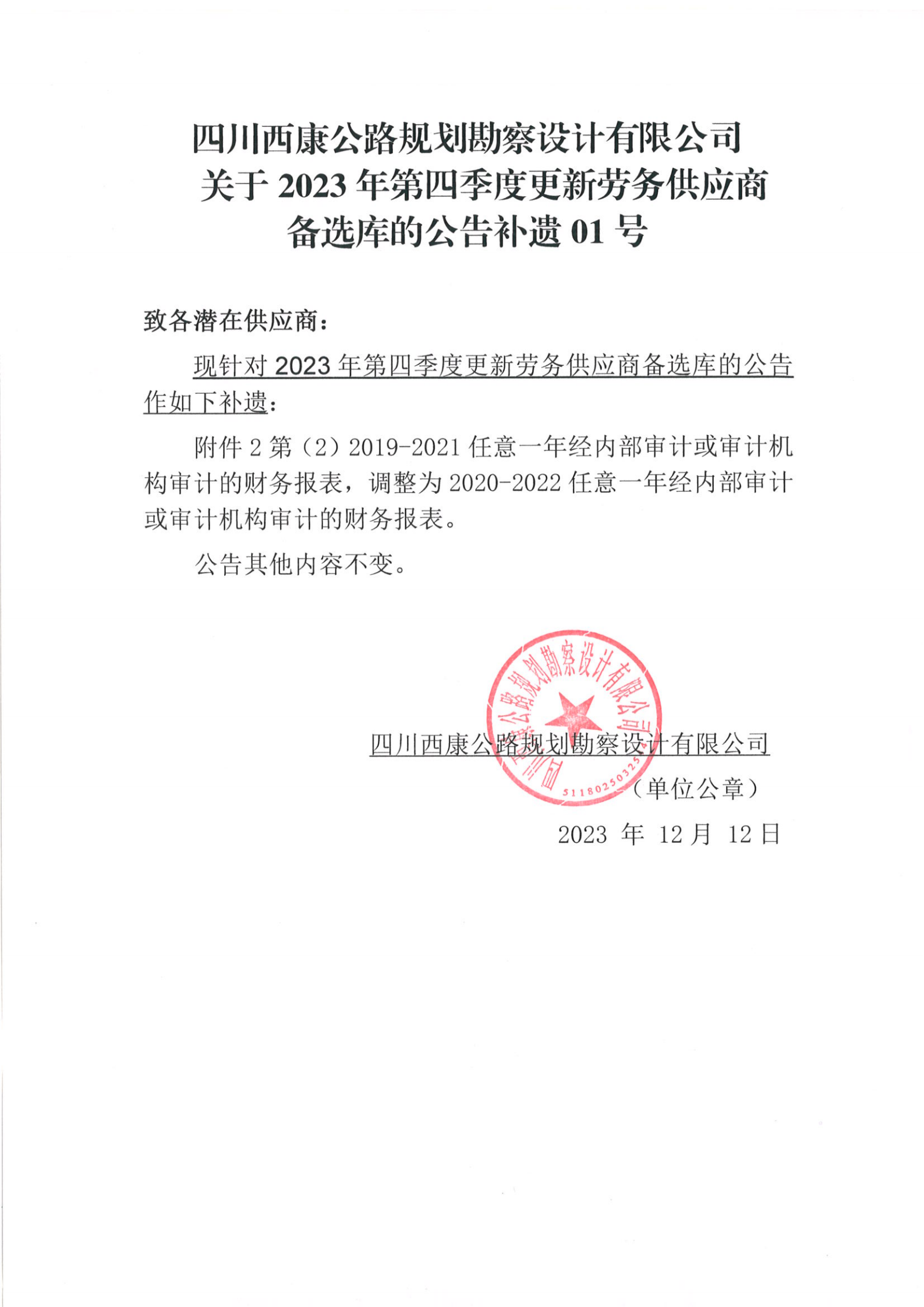 四川西康公路規(guī)劃勘察設(shè)計有限公司關(guān)于2023年第四季度更新勞務(wù)供應(yīng)商備選庫的公告補(bǔ)遺01號