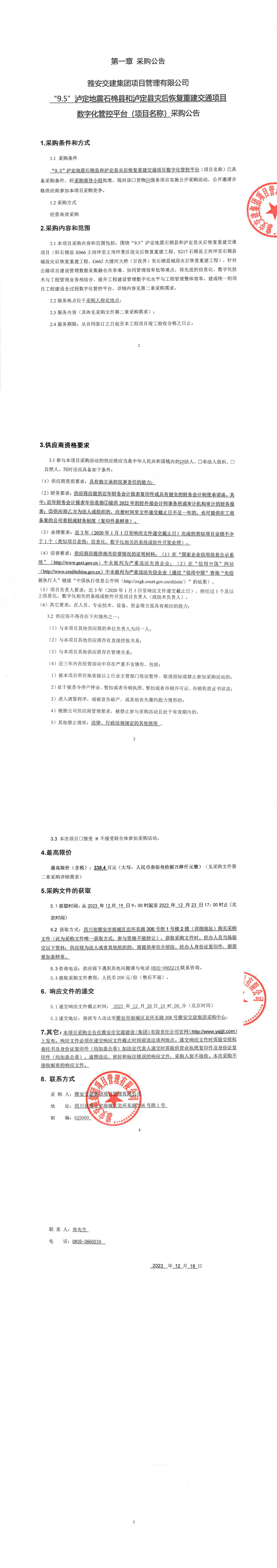 雅安交建集團項目管理有限公司“9.5”瀘定地震石棉縣和瀘定縣災后恢復重建交通項目數(shù)字化管控平臺(項目名稱)采購公告