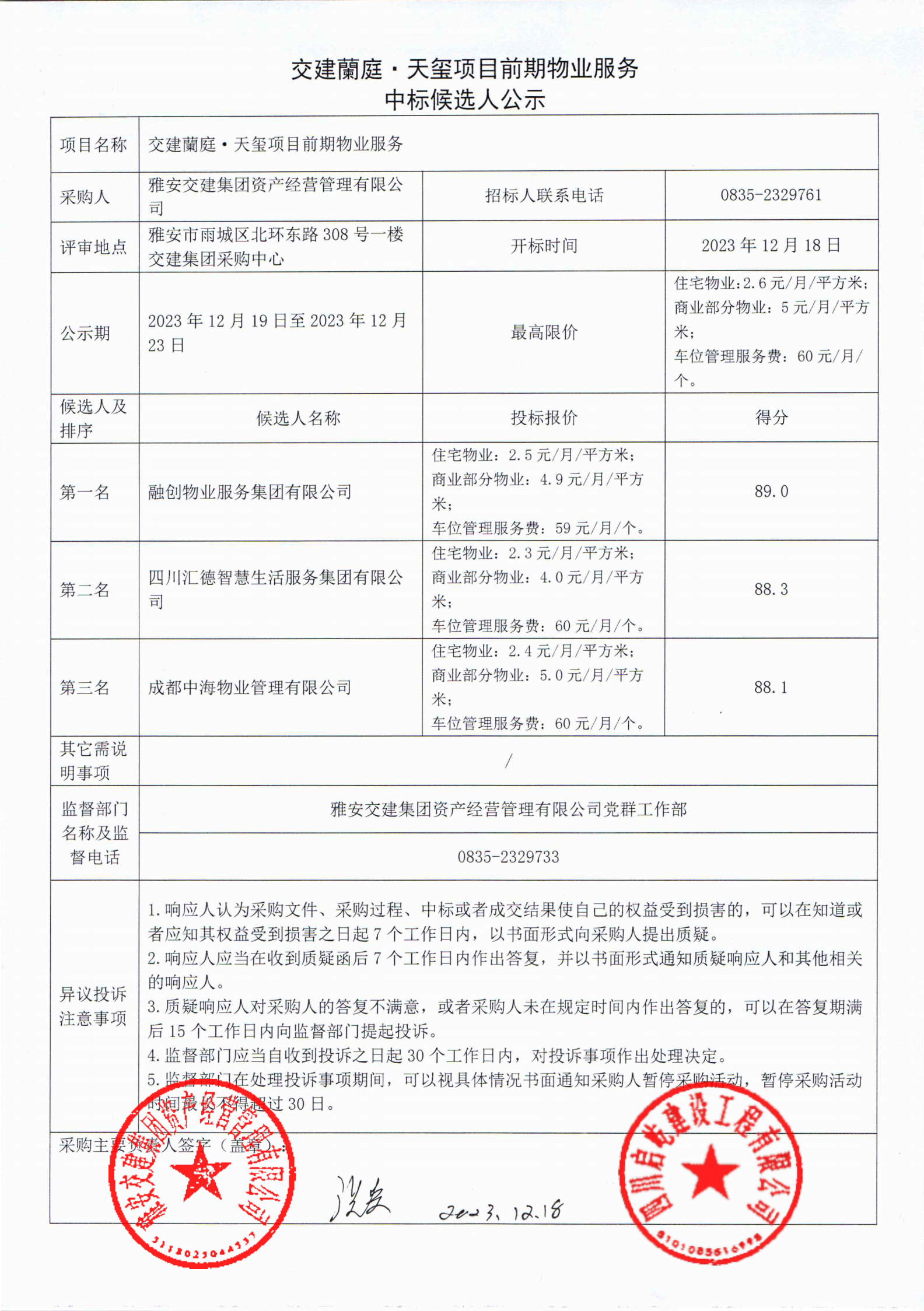 雅安交建集團資產(chǎn)經(jīng)營管理有限公司交建蘭庭·天璽項目前期物業(yè)服務中標候選人公示