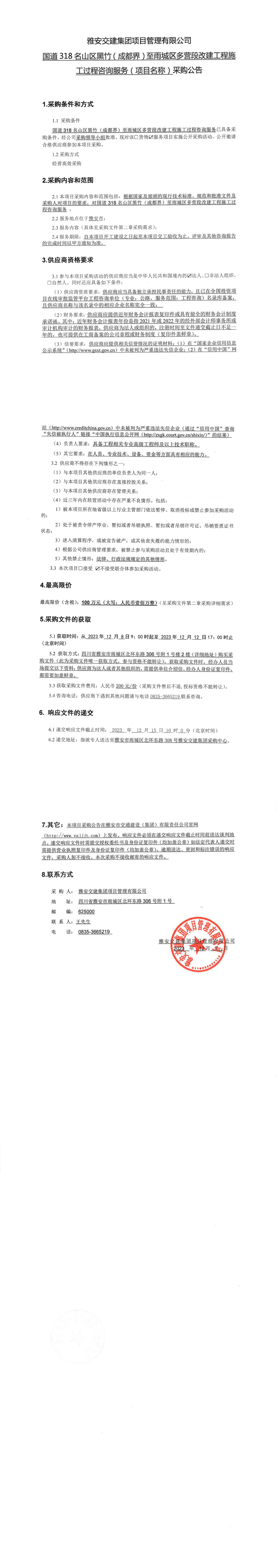 雅安交建集團(tuán)項(xiàng)目管理有限公司國(guó)道318名山區(qū)黑竹(成都界)至雨城區(qū)多營(yíng)段改建工程施工過程咨詢服務(wù)(項(xiàng)目名稱)采購(gòu)公告