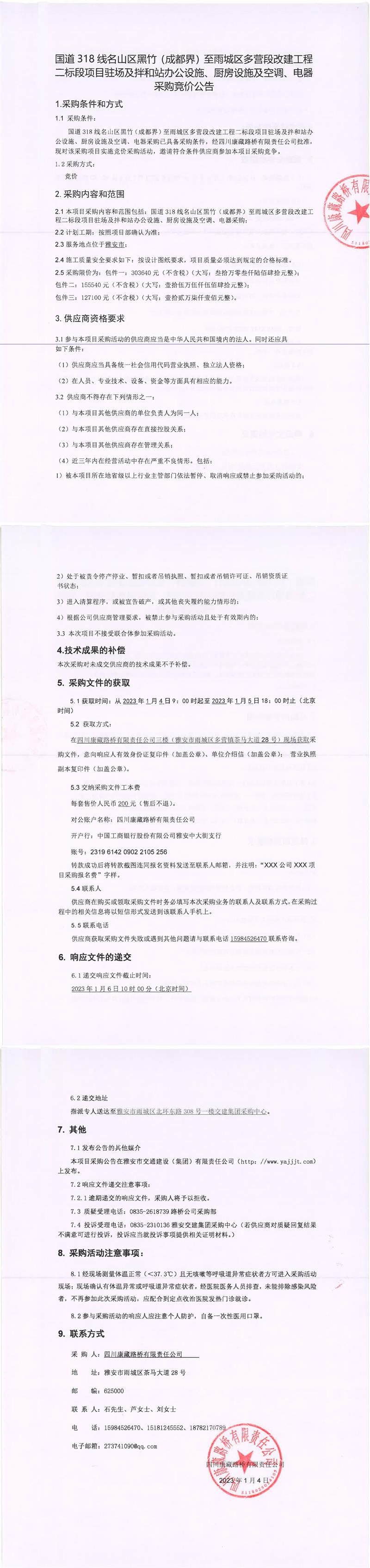 四川康藏路橋有限責(zé)任公司國道318線名山區(qū)黑竹(成都界)至雨城區(qū)多營段改建工程二標(biāo)段項(xiàng)目駐場(chǎng)及拌和站辦公設(shè)施、廚房設(shè)施及空調(diào)、電器采購競(jìng)價(jià)公告