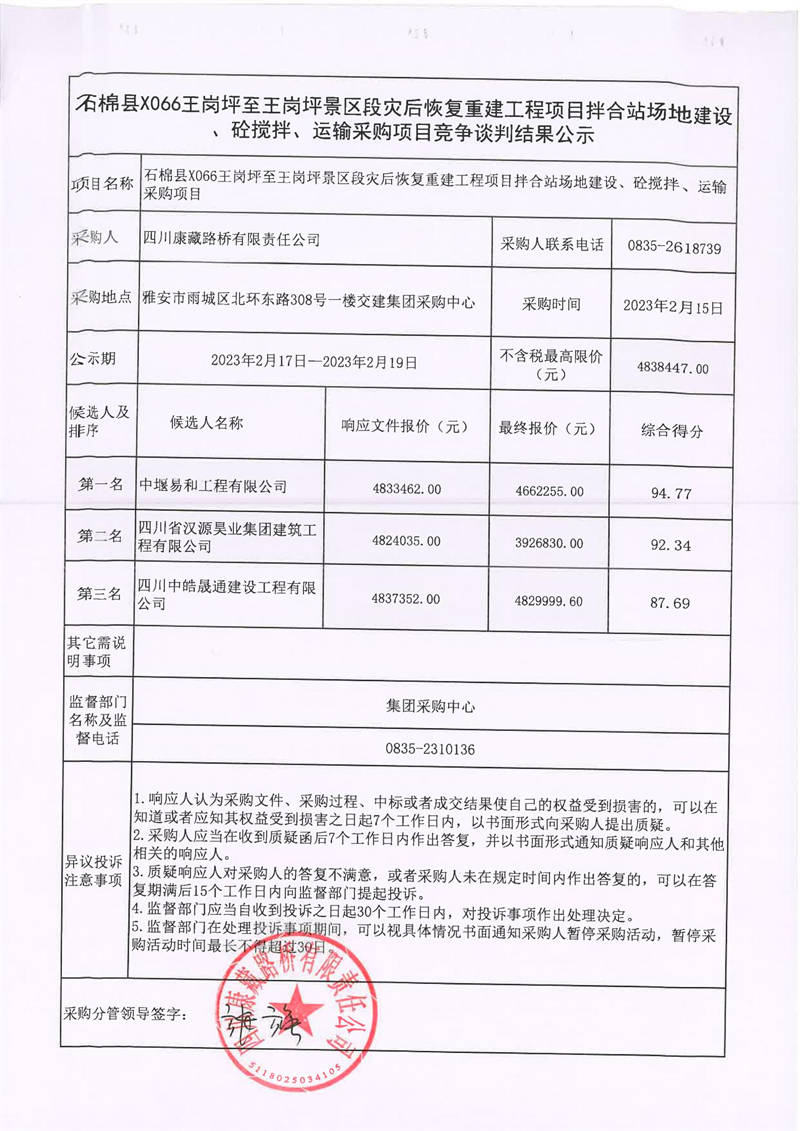 四川康藏路橋有限責任公司石棉縣X066王崗坪至王崗坪景區(qū)段災后恢復重建工程項目拌合站場地建設、砼攪拌、運輸采購項目競爭談判結(jié)果公示