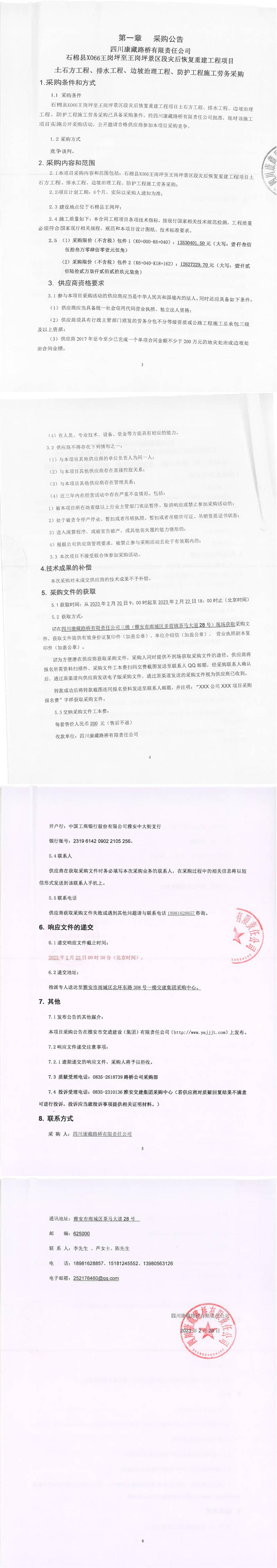 四川康藏路橋有限責(zé)任公司石棉縣X066王崗坪至王崗坪景區(qū)段災(zāi)后恢復(fù)重建工程項目土石方工程、排水工程、邊坡治理工程、防護工程施工勞務(wù)采購公告