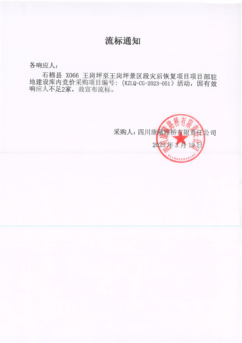 四川康藏路橋有限責(zé)任公司石棉縣X066王崗坪至王崗坪景區(qū)段災(zāi)后恢復(fù)項目項目部駐地建設(shè)庫內(nèi)競價采購流標通知