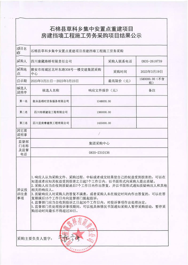 四川康藏路橋有限責任公司石棉縣草科鄉(xiāng)集中安置點重建項目房建擋墻工程施工勞務(wù)采購項目結(jié)果公示