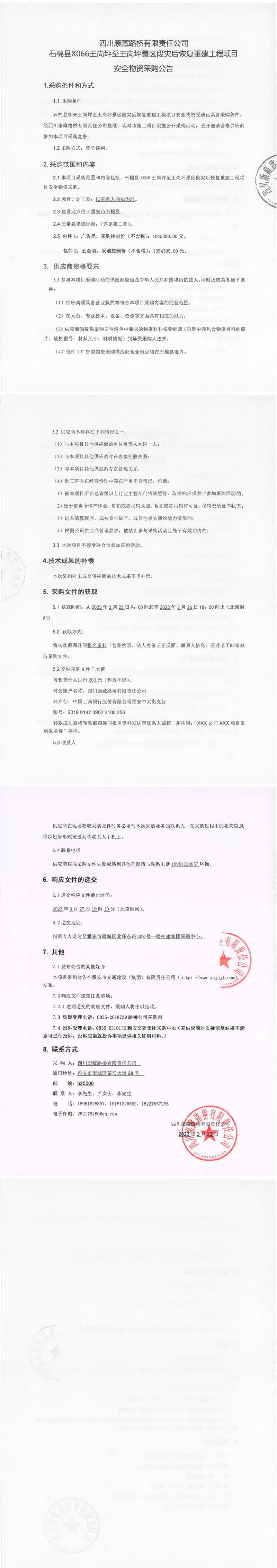 四川康藏路橋有限責(zé)任公司石棉縣X066王崗坪至王崗坪景區(qū)段災(zāi)后恢復(fù)重建工程項目安全物資采購公告