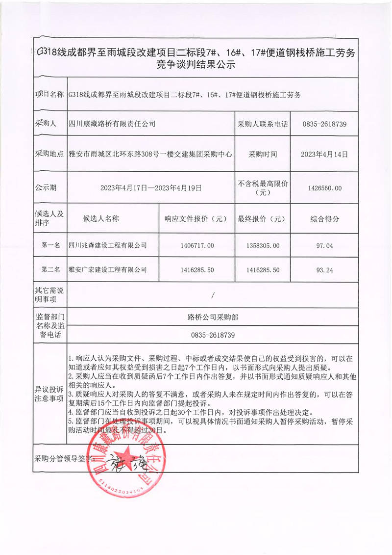 四川康藏路橋有限責(zé)任公司G318線成都至雨城段改建項(xiàng)目二標(biāo)段7#、16#、17#便道鋼棧橋施工勞務(wù)競爭談判結(jié)果公示