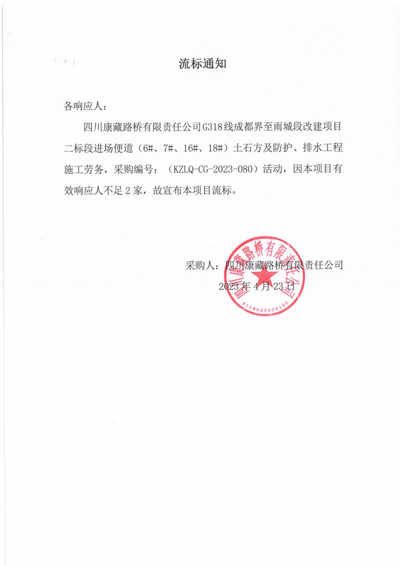 四川康藏路橋有限責(zé)任公司G318線成都至雨城段改建項(xiàng)目二標(biāo)段進(jìn)場便道(6#、7#、16#、18#)土石方及防護(hù)、排水工程施工勞務(wù)流標(biāo)通知