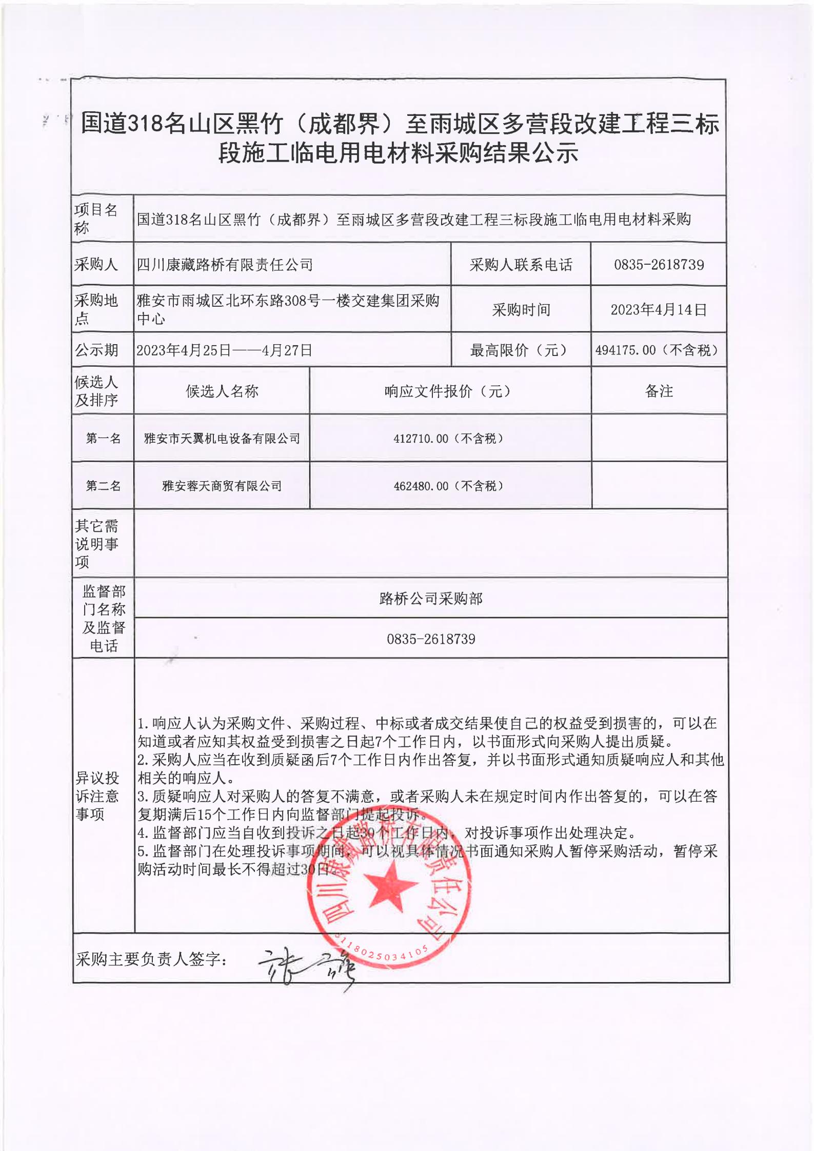四川康藏路橋有限責任公司國道318名山區(qū)黑竹(成都界)至雨城區(qū)多營段改建工程三標段施工臨電用電材料采購結(jié)果公示