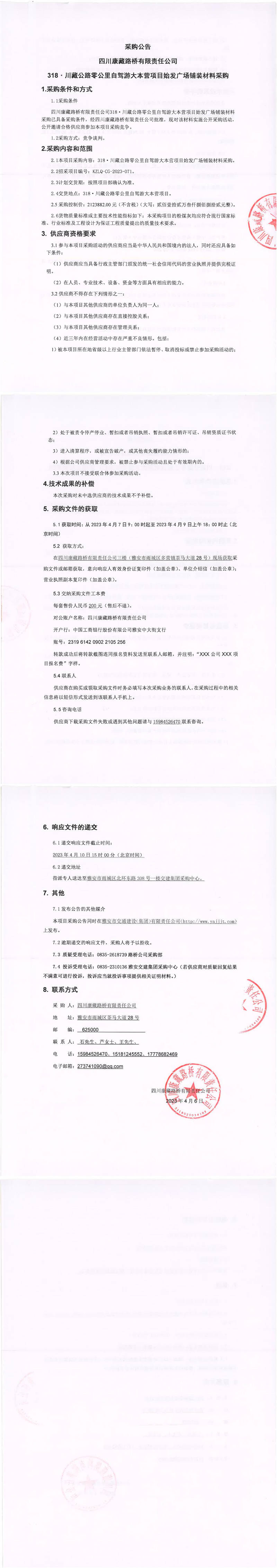 四川康藏路橋有限責(zé)任公司318·川藏公路零公里自駕游大本營(yíng)項(xiàng)目始發(fā)廣場(chǎng)鋪裝材料采購(gòu)公告