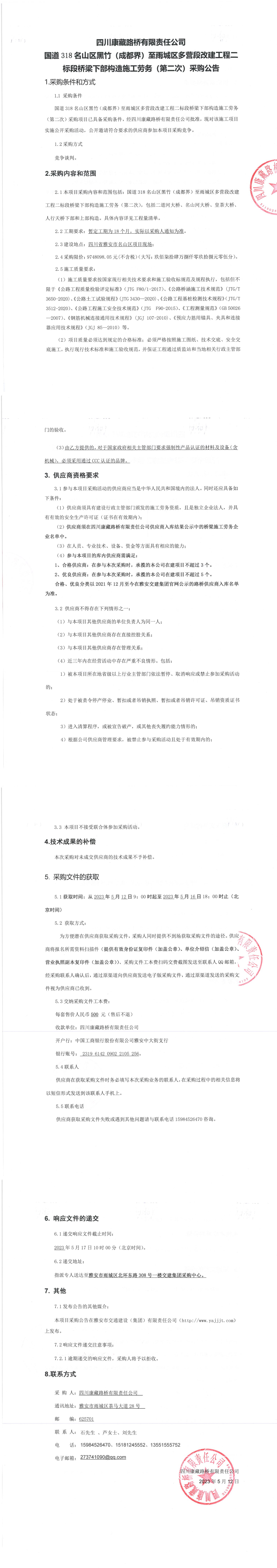四川康藏路橋有限責(zé)任公司國(guó)道318名山區(qū)黑竹(成都界)至雨城區(qū)多營(yíng)段改建工程二標(biāo)段橋梁下部構(gòu)造施工勞務(wù)(第二次)采購(gòu)公告