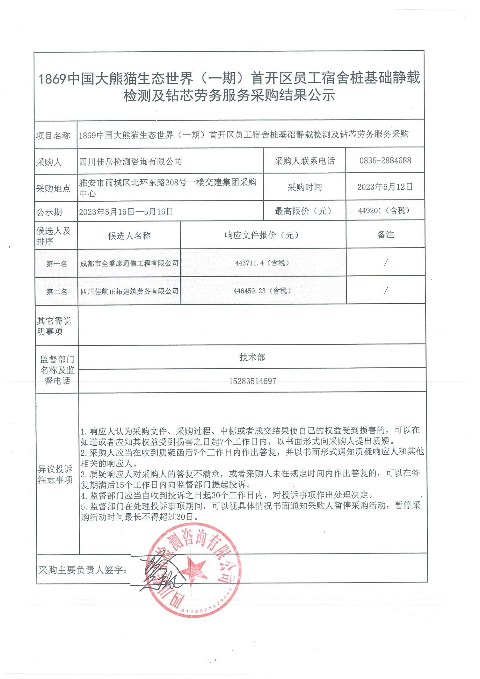 四川佳岳檢測(cè)咨詢有限公司關(guān)于1869中國(guó)大熊貓生態(tài)世界(一期)首開區(qū)員工宿舍樁基礎(chǔ)靜載檢測(cè)勞務(wù)及鉆芯項(xiàng)目中標(biāo)結(jié)果公示