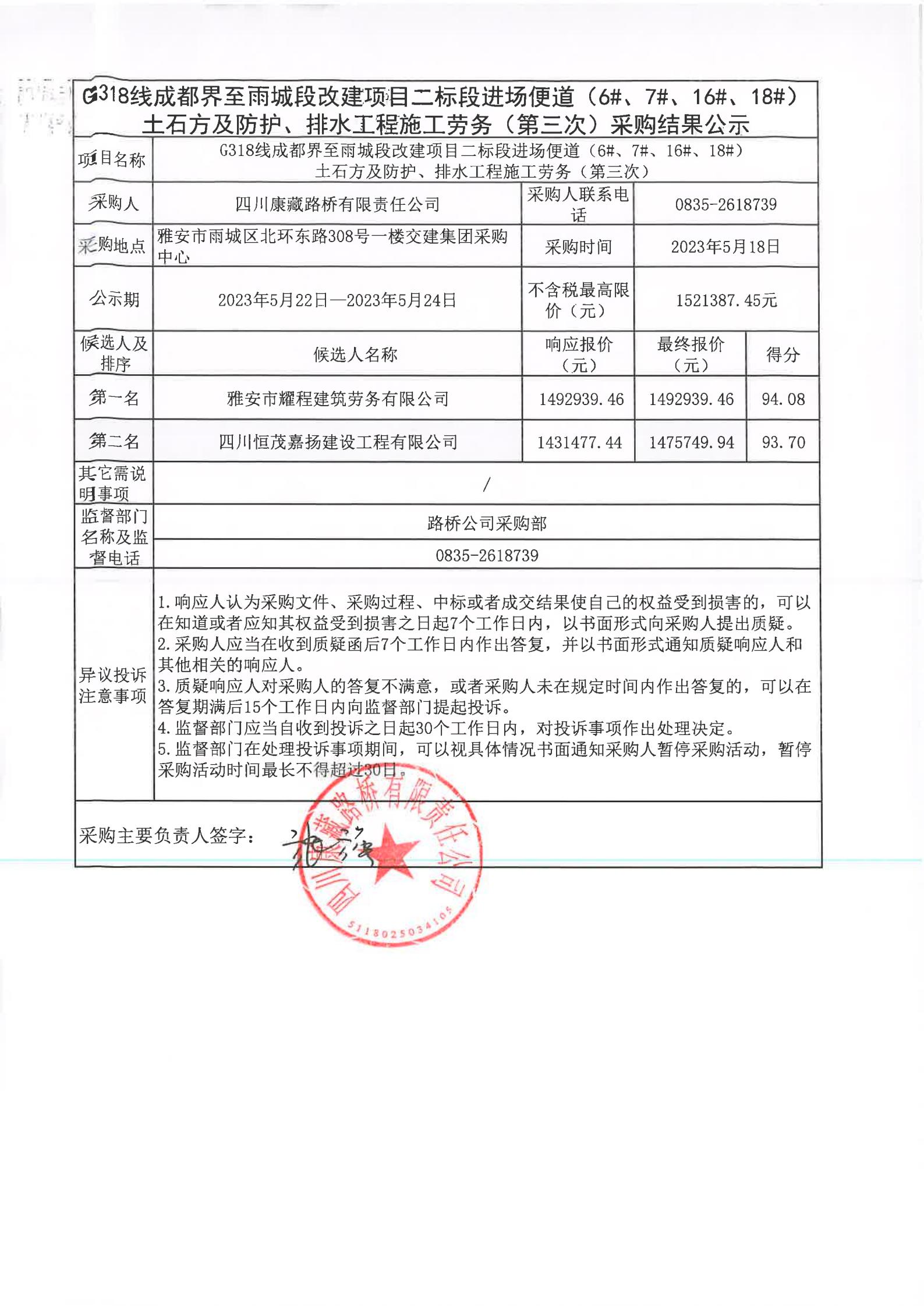 四川康藏路橋有限責(zé)任公司G318線(xiàn)成都至雨城段改建項(xiàng)目二標(biāo)段進(jìn)場(chǎng)便道(6#、7#、16#、18#)土石方及防護(hù)、排水工程施工勞務(wù)(第三次)采購(gòu)結(jié)果公示
