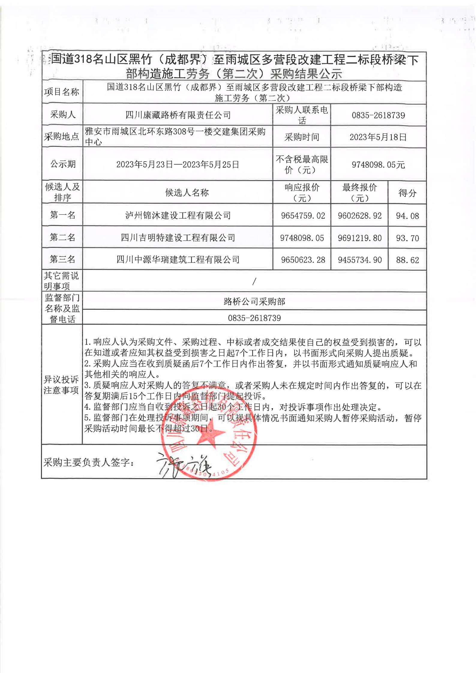 四川康藏路橋有限責任公司國道318名山區(qū)黑竹(成都界)至雨城區(qū)多營段改建工程二標段橋梁下部構造施工勞務(第二次)采購結果公示