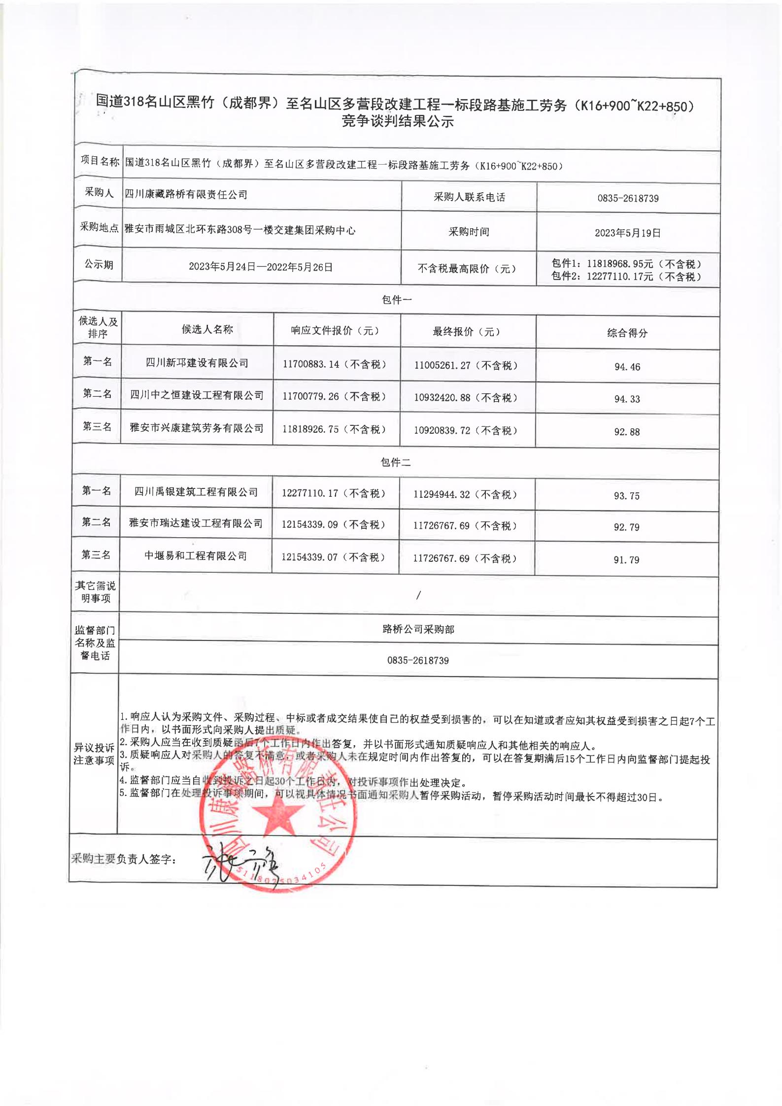 四川康藏路橋有限責任公司國道318名山區(qū)黑竹(成都界)至雨城區(qū)多營段改建工程一標段路基施工勞務(wù)(K16+900~K22+850)競爭談判結(jié)果公示