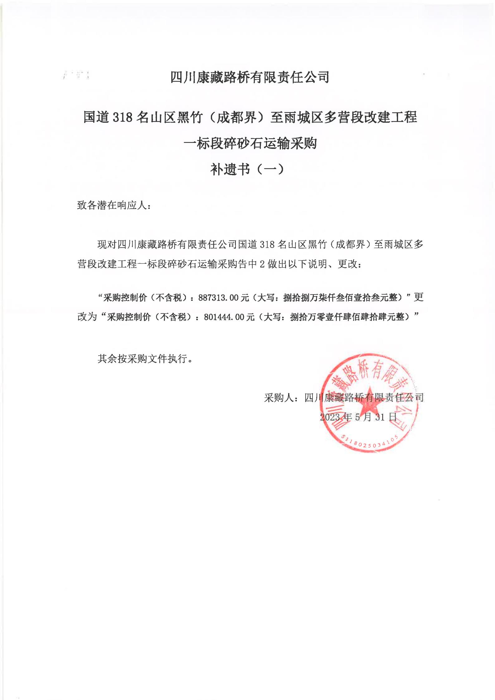 四川康藏路橋有限責任公司國道318名山區(qū)黑竹(成都界)至雨城區(qū)多營段改建工程一標段碎砂石運輸采購補遺書(一)