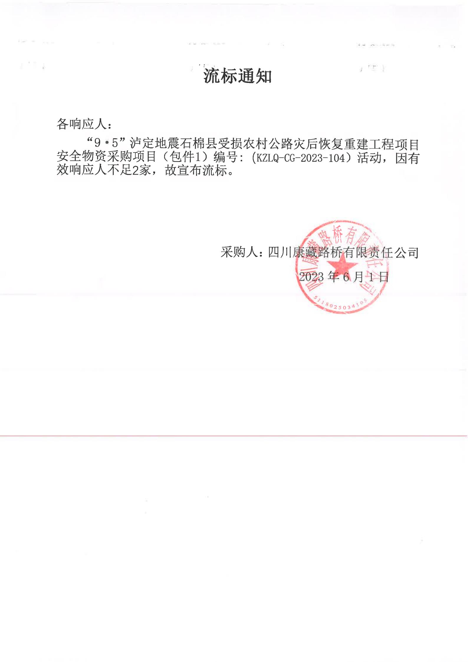 四川康藏路橋有限責任公司“9·5”瀘定地震石棉縣受損農(nóng)村公路災后恢復重建工程項目安全物資項目(包件1)流標通知