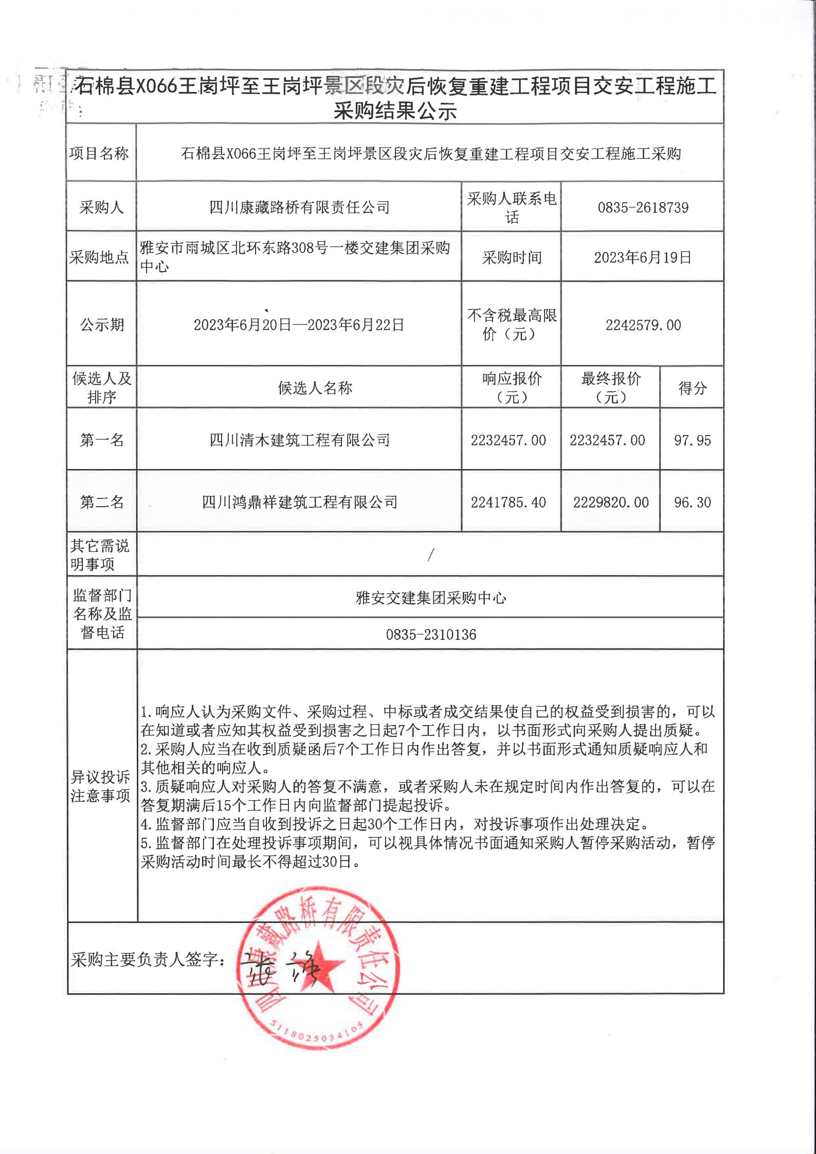 四川康藏路橋有限責(zé)任公司石棉縣X066王崗坪至王崗坪景區(qū)段災(zāi)后恢復(fù)重建工程項目交安工程施工采購結(jié)果公示