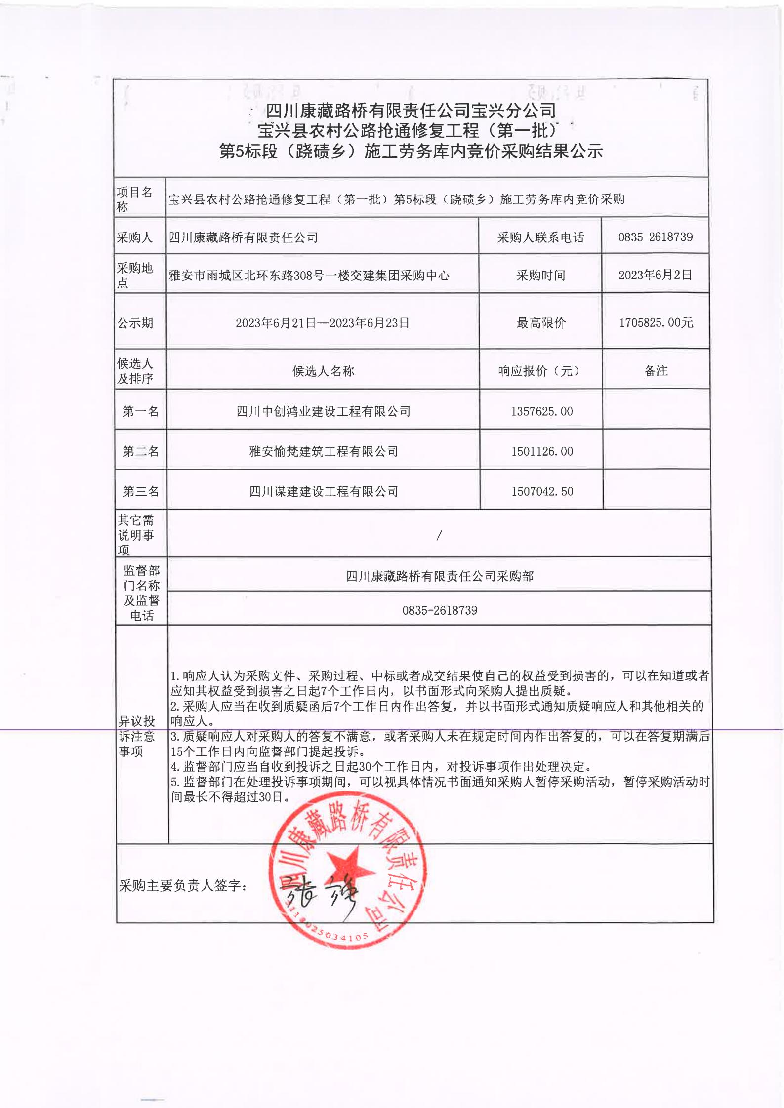 四川康藏路橋有限責任公司寶興分公司寶興縣農(nóng)村公路搶通修復工程(第一批)第5標段(蹺磧鄉(xiāng))施工勞務庫內(nèi)競價采購結(jié)果公示