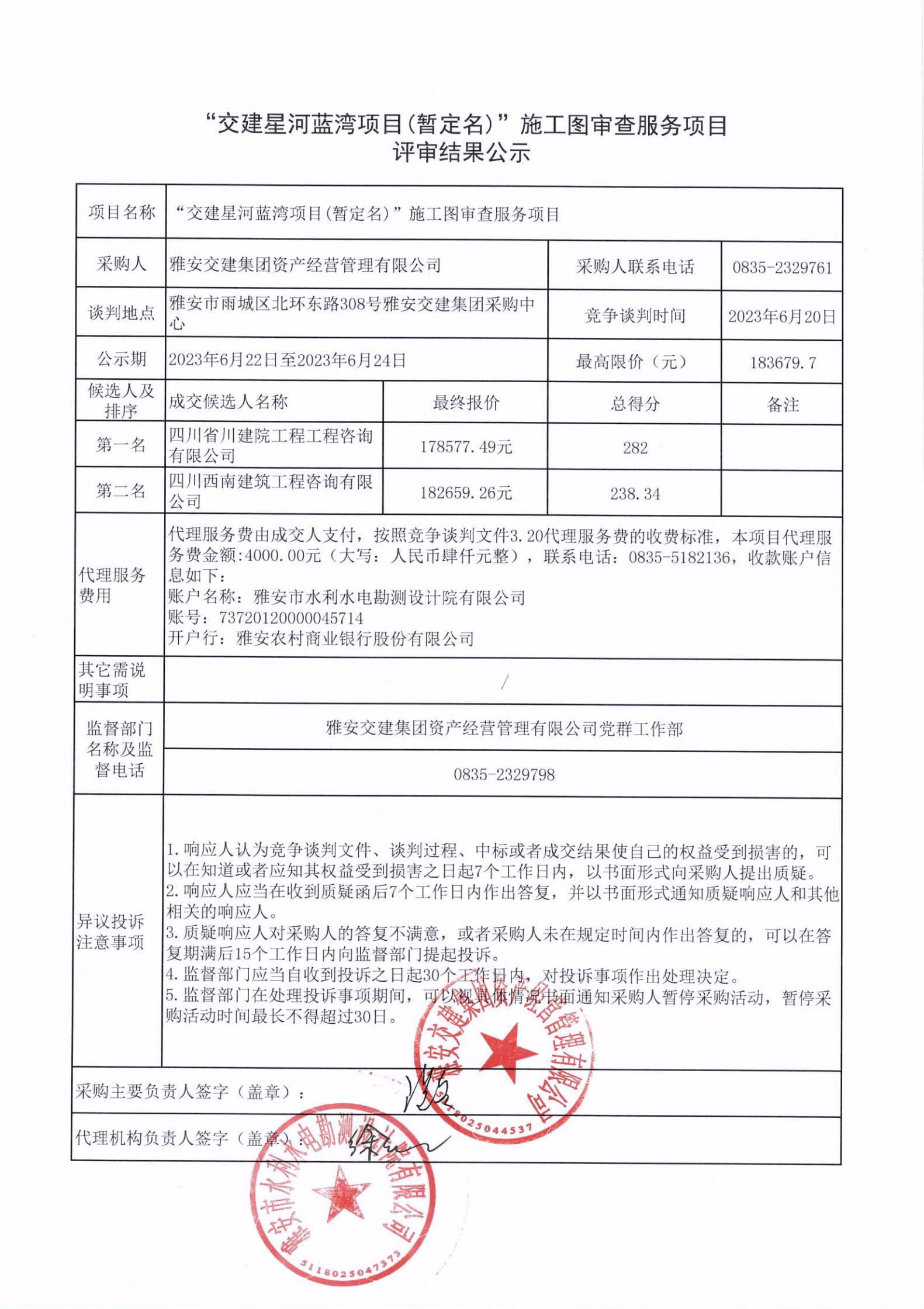 雅安交建集團(tuán)資產(chǎn)經(jīng)營管理有限公司“交建星河藍(lán)灣項(xiàng)目(暫定名)”施工圖審查服務(wù)項(xiàng)目評(píng)審結(jié)果公示