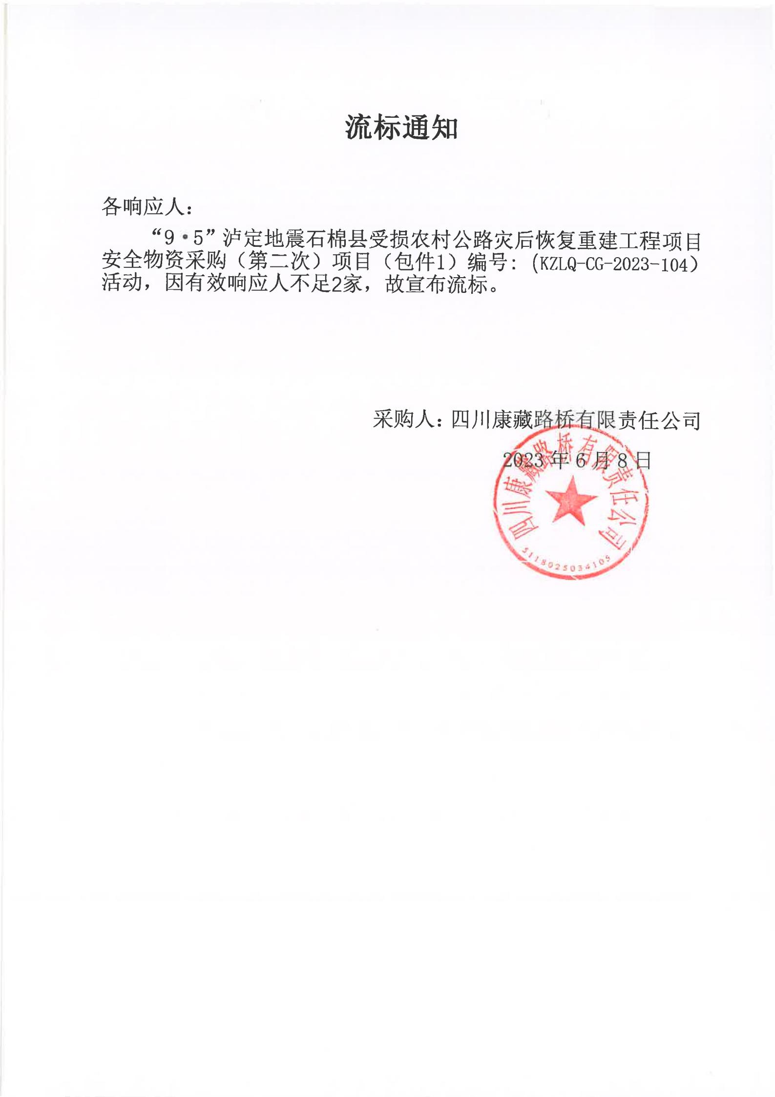 四川康藏路橋有限責(zé)任公司“9·5”瀘定地震石棉縣受損農(nóng)村公路災(zāi)后恢復(fù)重建工程項(xiàng)目安全物資競(jìng)價(jià)采購(第二次)流標(biāo)通知