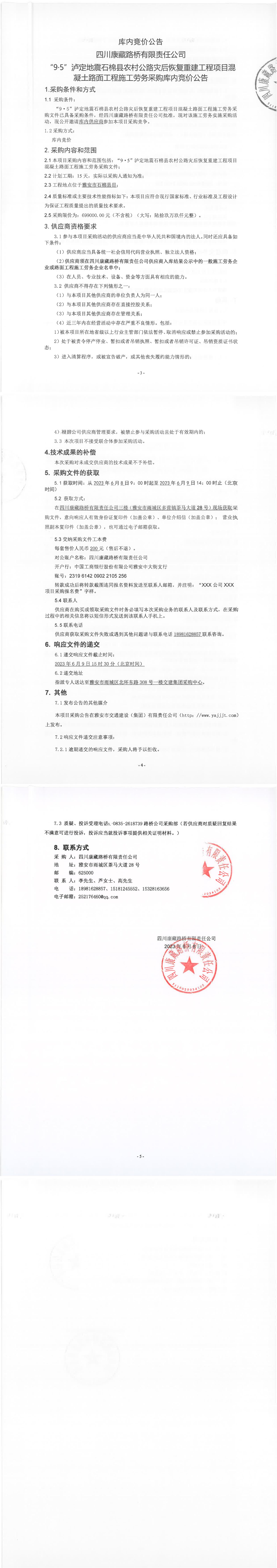 四川康藏路橋有限責任公司“9·5”瀘定地震石棉縣農(nóng)村公路災(zāi)后恢復(fù)重建工程項目混凝土路面工程施工勞務(wù)采購庫內(nèi)競價公告