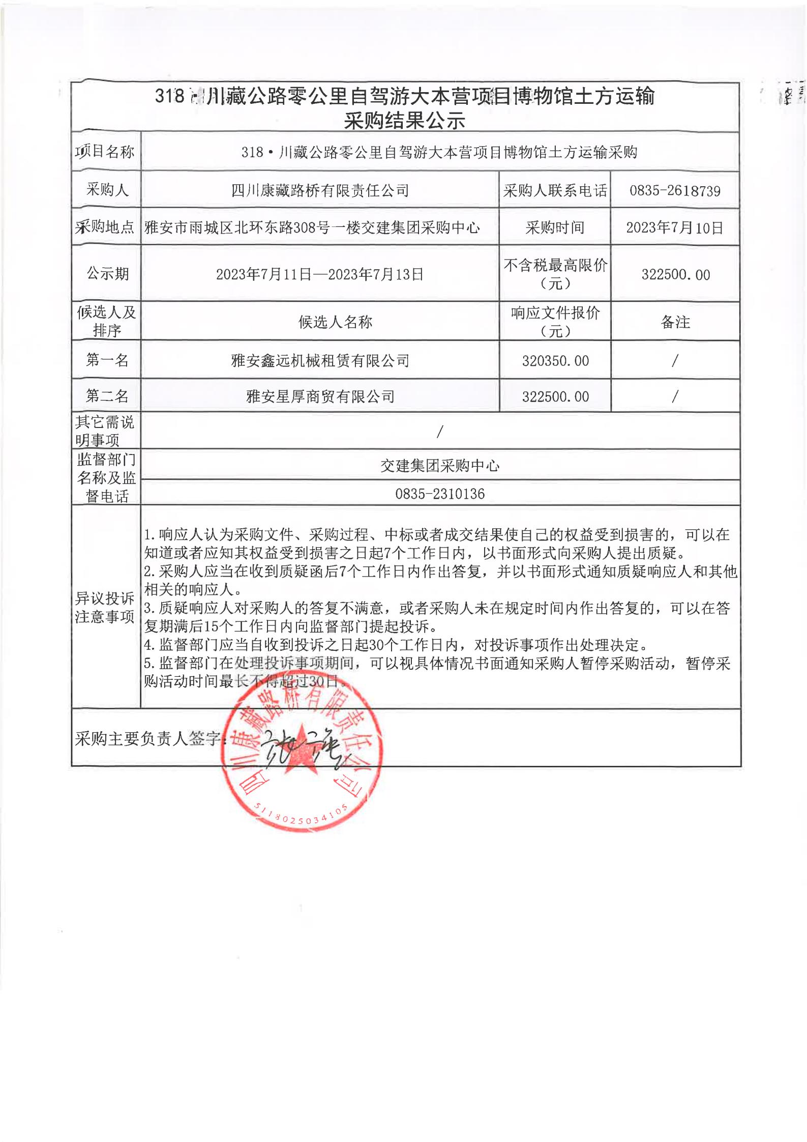 四川康藏路橋有限責(zé)任公司318·川藏公路零公里自駕游大本營項目博物館土方運(yùn)輸采購結(jié)果公示