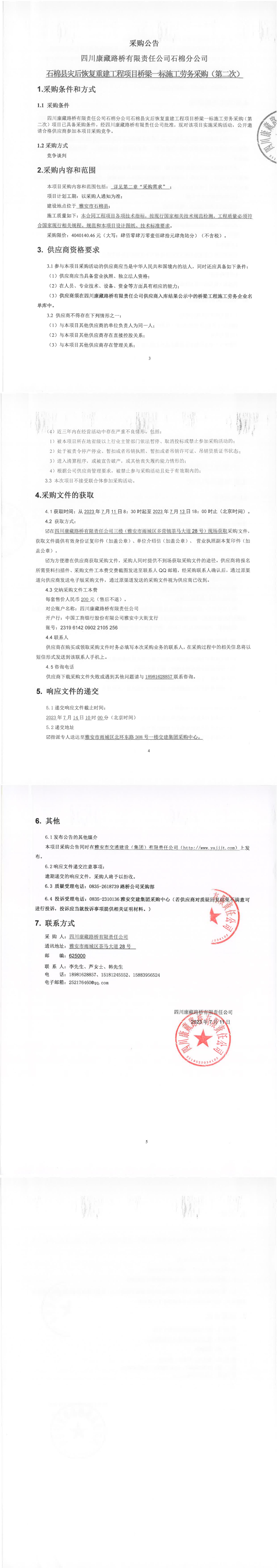 四川康藏路橋有限責(zé)任公司石棉縣災(zāi)后恢復(fù)重建工程項(xiàng)目橋梁一標(biāo)段施工勞務(wù)采購(第二次)