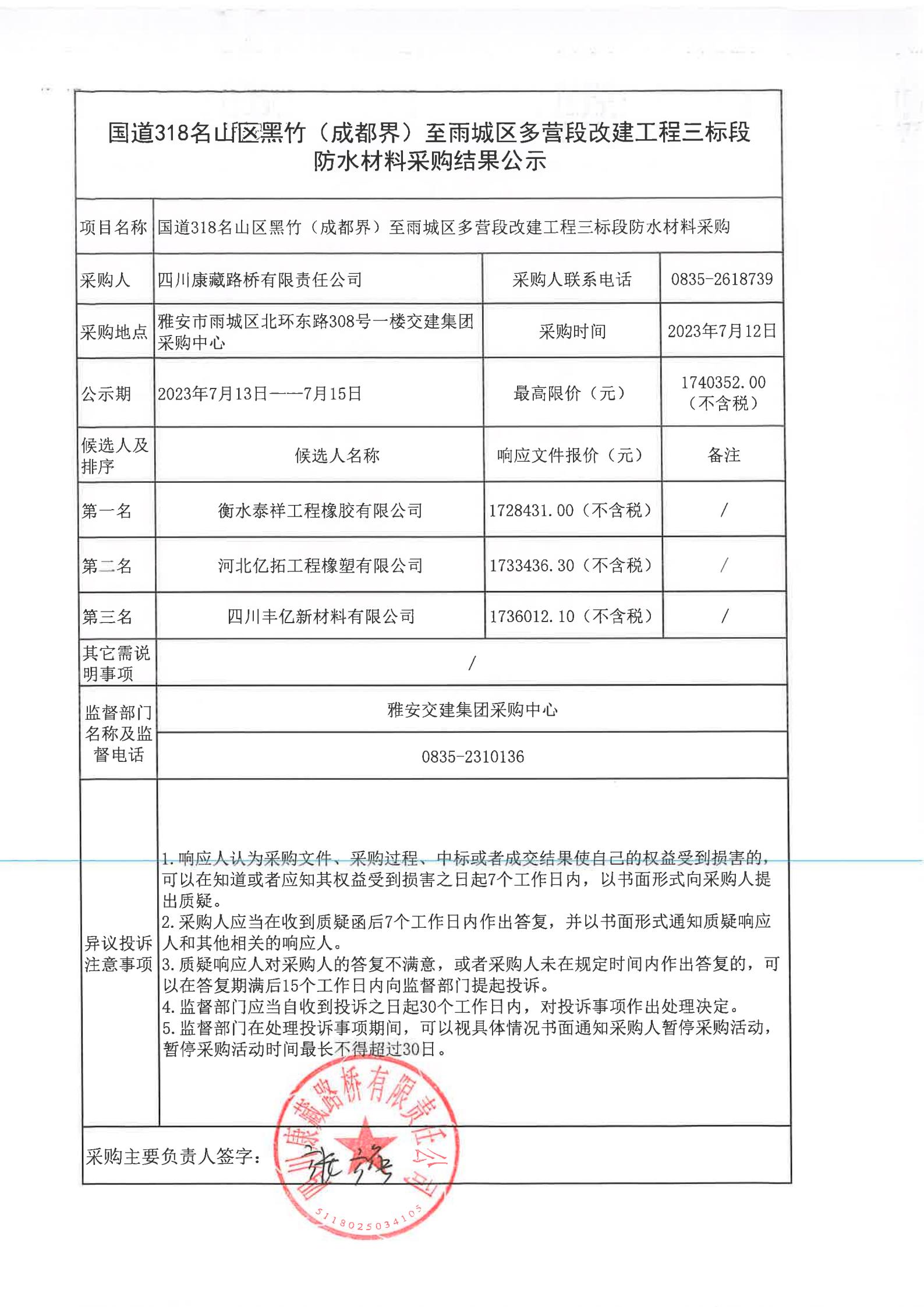 四川康藏路橋有限責任公司國道318名山區(qū)黑竹(成都界)至雨城區(qū)多營段改建工程三標段防水材料采購結果公示