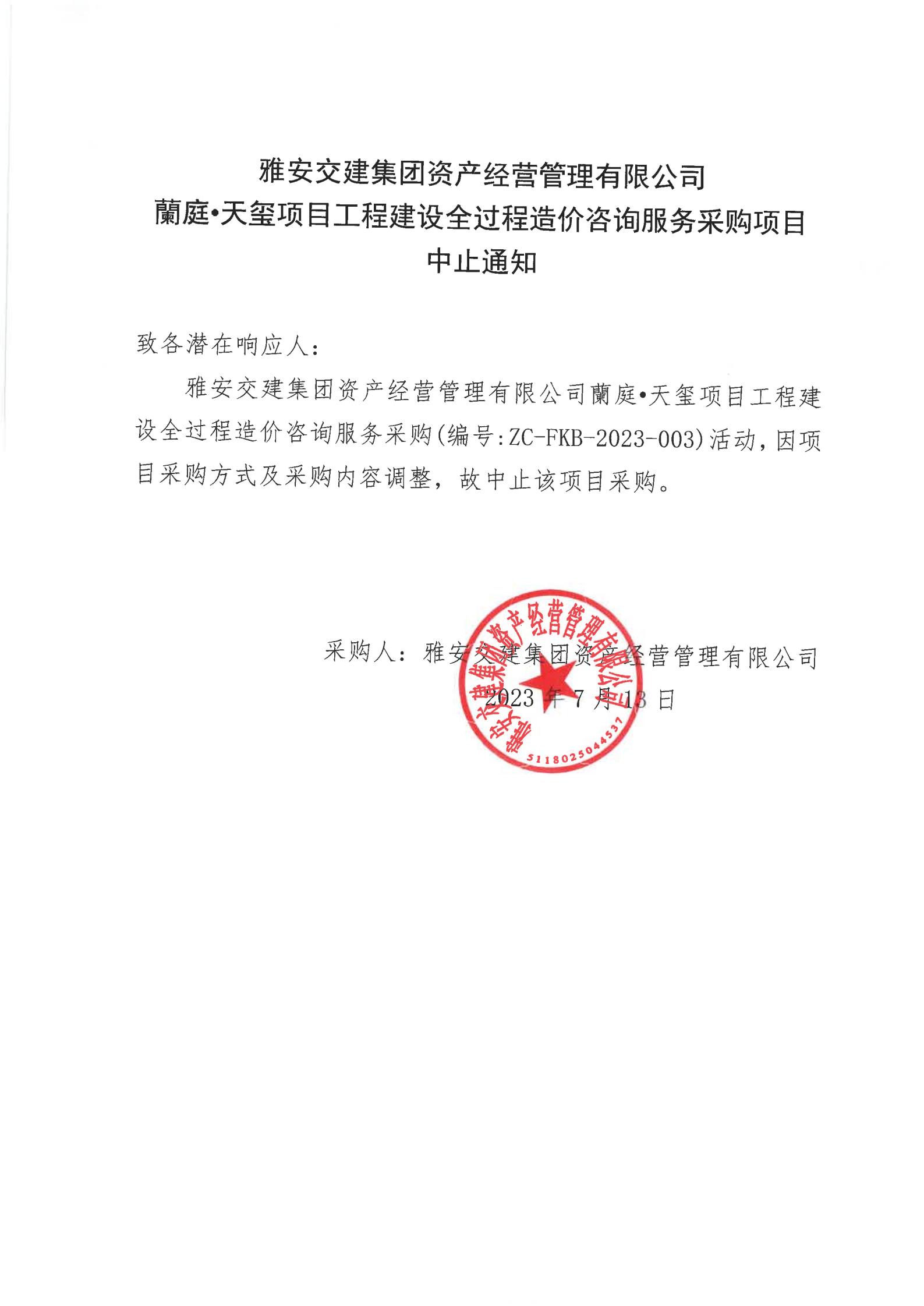 雅安交建集團(tuán)資產(chǎn)經(jīng)營(yíng)管理有限公司蘭庭·天璽項(xiàng)目工程建設(shè)全過程造價(jià)咨詢服務(wù)采購(gòu)項(xiàng)目中止通知