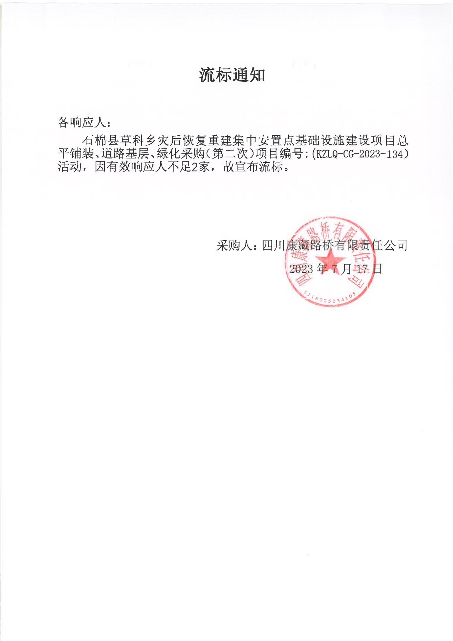 四川康藏路橋有限責(zé)任公司石棉縣草科鄉(xiāng)災(zāi)后恢復(fù)重建集中安置點基礎(chǔ)設(shè)施建設(shè)項目總平鋪裝、道路基層、綠化采購(第二次)流標(biāo)通知