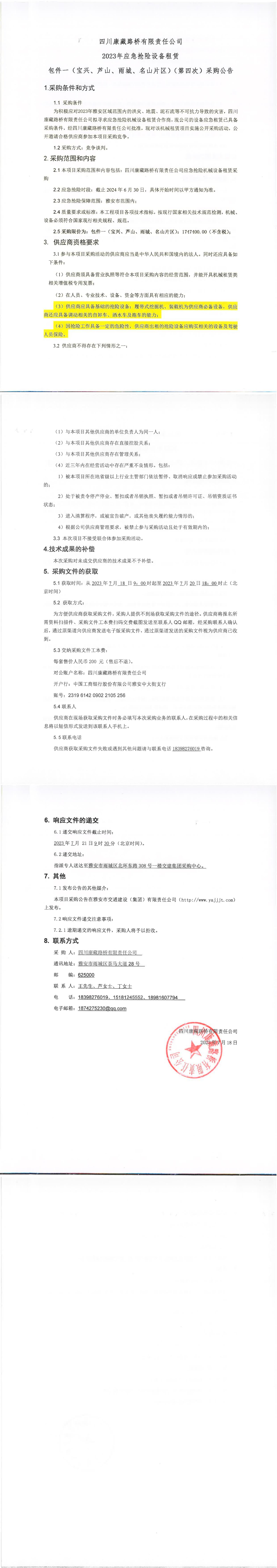 四川康藏路橋有限責(zé)任公司2023年應(yīng)急搶險(xiǎn)設(shè)備租賃包件一(寶興、蘆山、雨城、名山片區(qū))(第四次)采購(gòu)公告